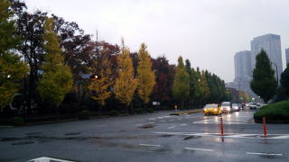 街路樹も紅葉が終わりかけて、雨に濡れているので